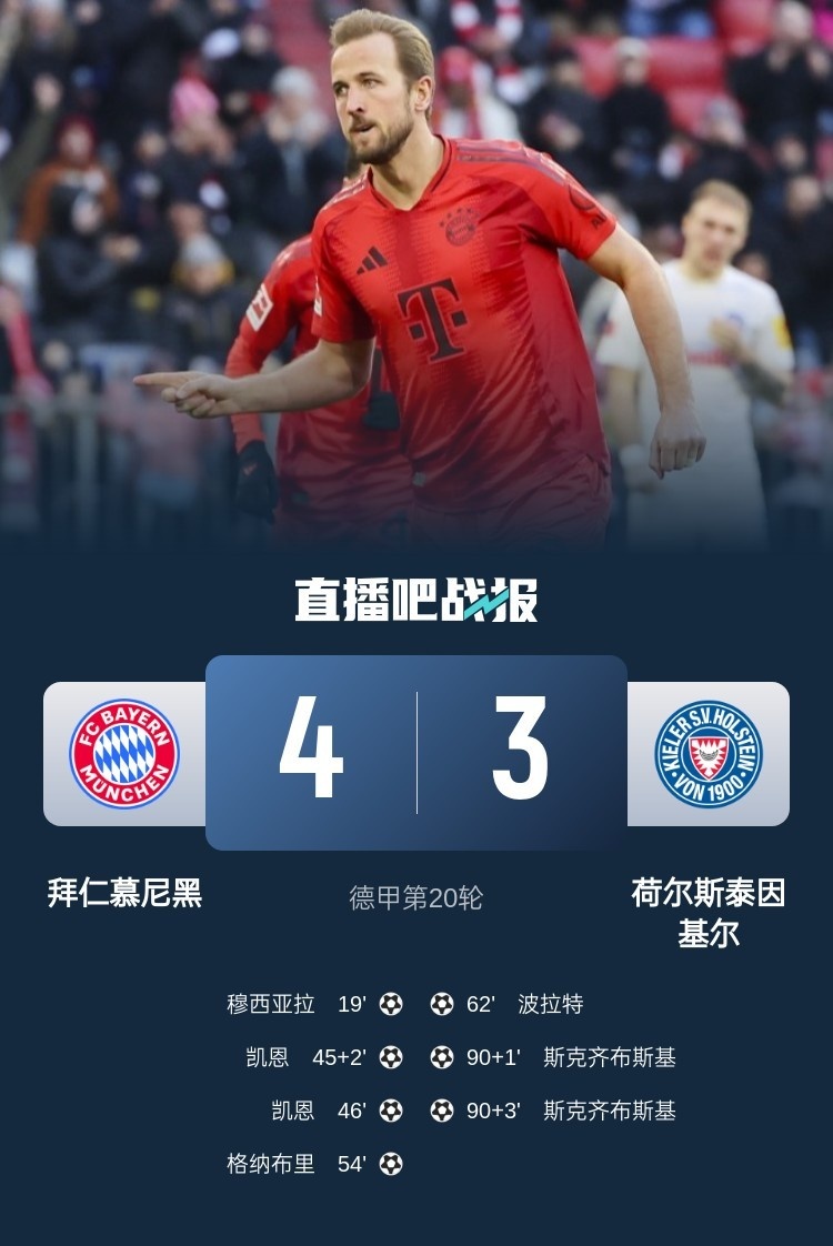 驚險!拜仁補時(shí)連丟2球4-3基爾 拜仁聯(lián)賽6連勝暫9分領(lǐng)跑&凱恩雙響