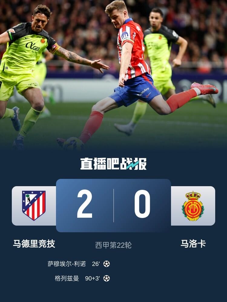 西甲-馬競2-0馬洛卡先賽距榜首1分 利諾建功格列茲曼吊射破門(mén)