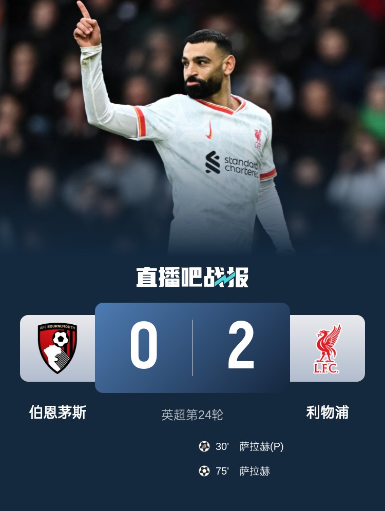 薩拉赫梅開(kāi)二度,利物浦2-0戰勝伯恩茅斯,9分領(lǐng)跑積分榜。