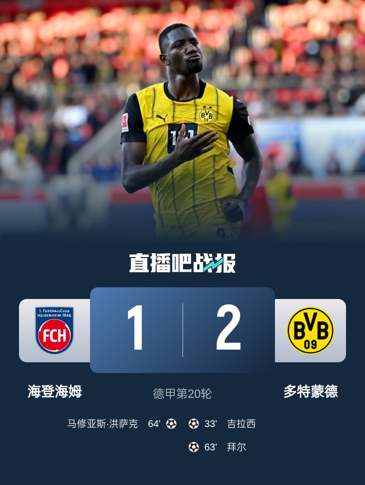 多特客場(chǎng)2-1擊敗海登海姆,結束4輪不勝。