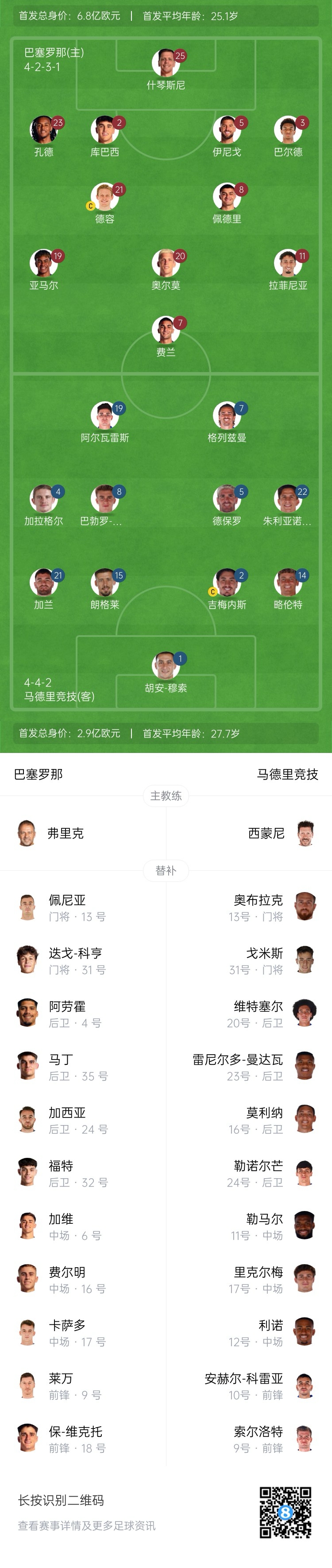 巴薩首發(fā):25-什琴斯尼、2-庫巴西、3-巴爾德、5-伊尼戈-馬丁內斯、23-孔德、8-佩德里、20-奧爾莫、21-德容、7-費蘭-托雷斯、11-拉菲尼亞、19-亞馬爾