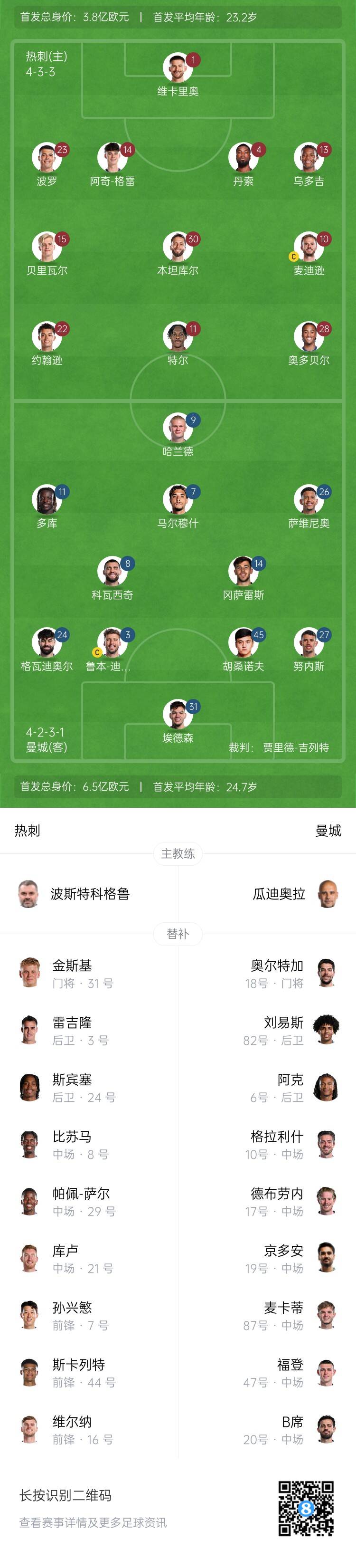 2月27日訊 英超第27輪,熱刺主場(chǎng)對陣曼城。賽前,官方公布了本場(chǎng)的首發(fā)名單。