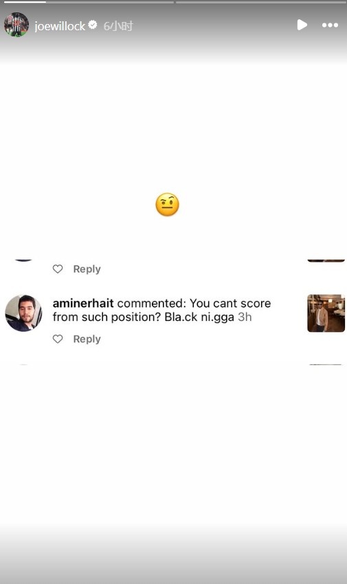 比賽結束后,威洛克在社媒上曬出了他在網(wǎng)上收到的種族主義辱罵的截圖。