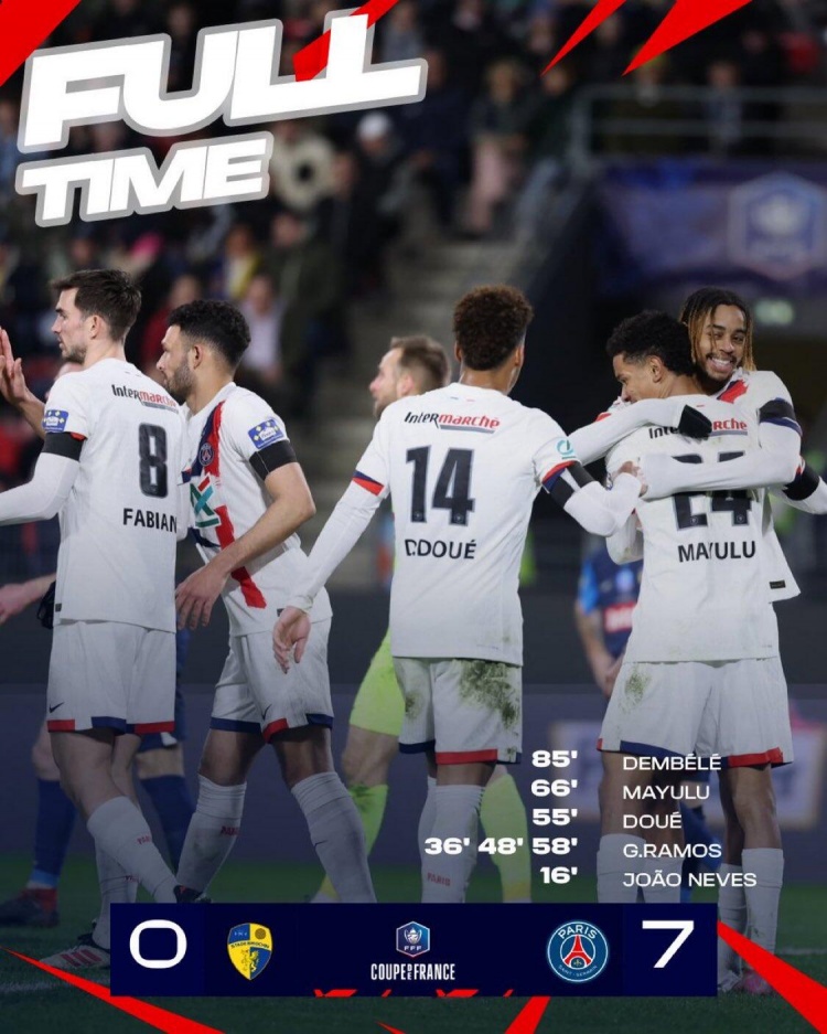 法國杯-巴黎7-0大勝布里歐齊 貢薩洛-拉莫斯3射1傳杜埃1射2傳