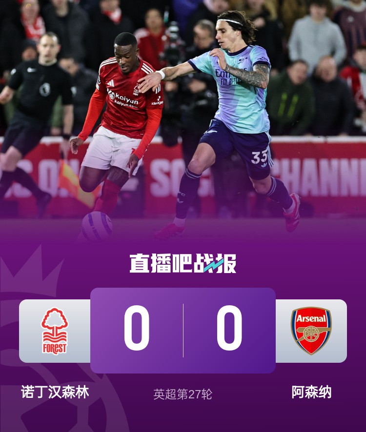 拉亞獻神撲,最終阿森納0-0諾丁漢森林,兩輪不勝后距榜首13分。
