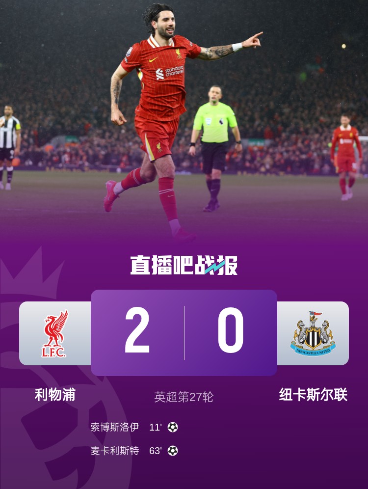 索博斯洛伊、麥卡利斯特破門(mén),利物浦主場(chǎng)2-0戰勝紐卡,多賽一場(chǎng)領(lǐng)先阿森納13分。