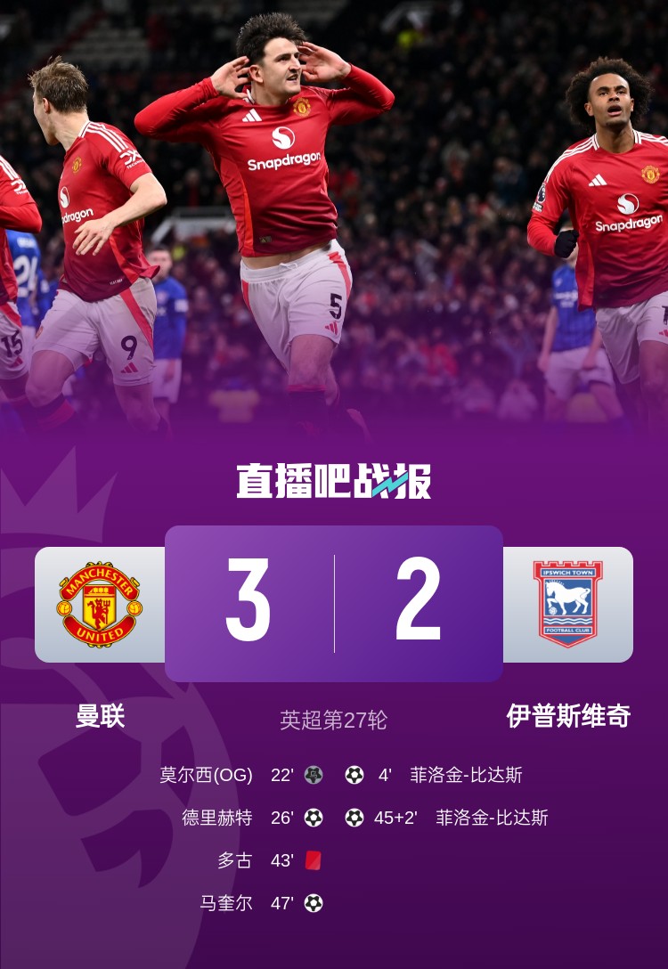 多古送禮+染紅,馬奎爾頭球破門(mén),曼聯(lián)3-2逆轉伊普斯維奇。
