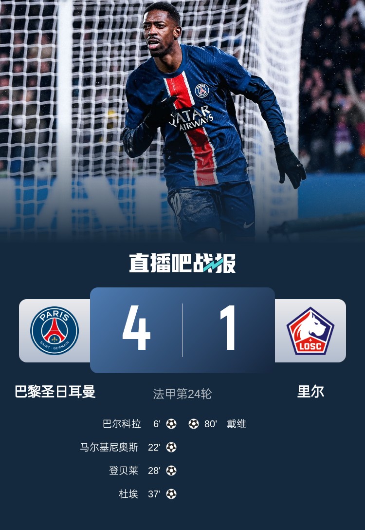 巴黎本輪4-1大勝里爾,此役后球隊10連勝,以16分優(yōu)勢領(lǐng)跑。