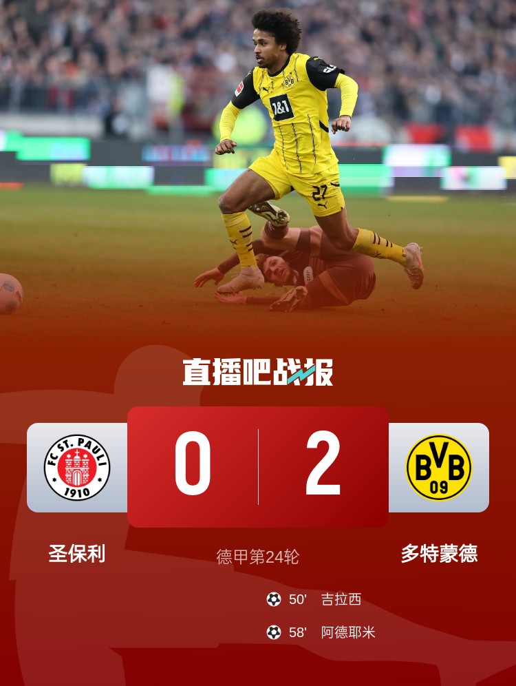 多特本輪2-0擊敗圣保利,吉拉西、阿德耶米的進(jìn)球為多特拿下3分。
