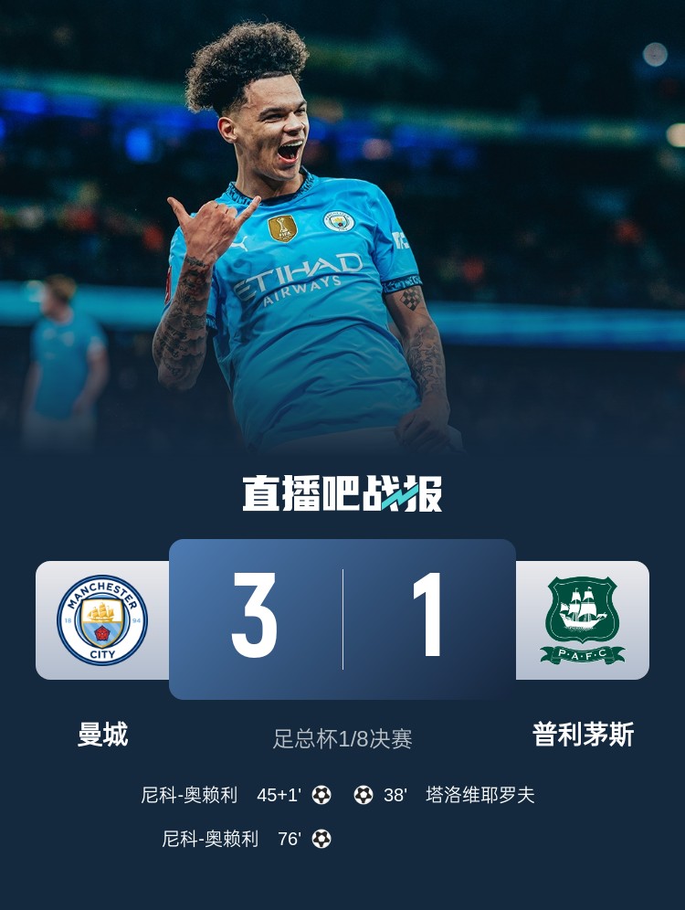 曼城足總杯3-1擊敗普利茅斯,奧賴(lài)利雙響建功,丁丁傳射。