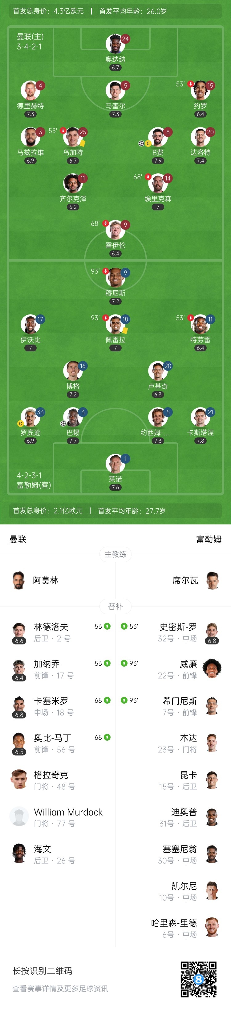 上半場(chǎng)傷停補時(shí)1分鐘,半場(chǎng)戰罷,曼聯(lián)暫0-1富勒姆。