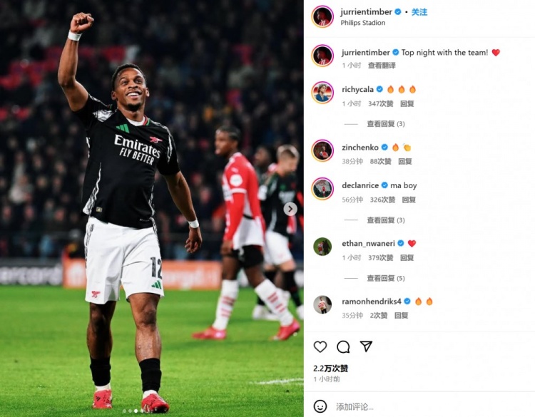 廷伯在本場(chǎng)比賽為槍手第18分鐘頭球首開(kāi)記錄,他也曬出慶祝照并配文:“全隊表現頂級的一晚!”