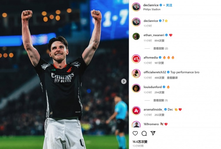 厄德高在本場(chǎng)比賽2射1傳,賴(lài)斯也送出1次助攻,兩人都通過(guò)社媒曬出自己的慶祝照,并簡(jiǎn)單配文“7”。