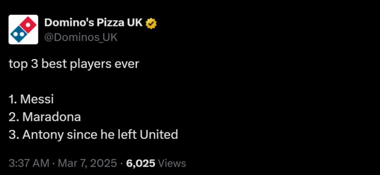 3月7日訊 歐聯(lián)杯1/8決賽首回合,貝蒂斯2-2戰平吉馬良斯。賽后,知名披薩連鎖品牌達美樂(lè )英國區官推盛贊安東尼。