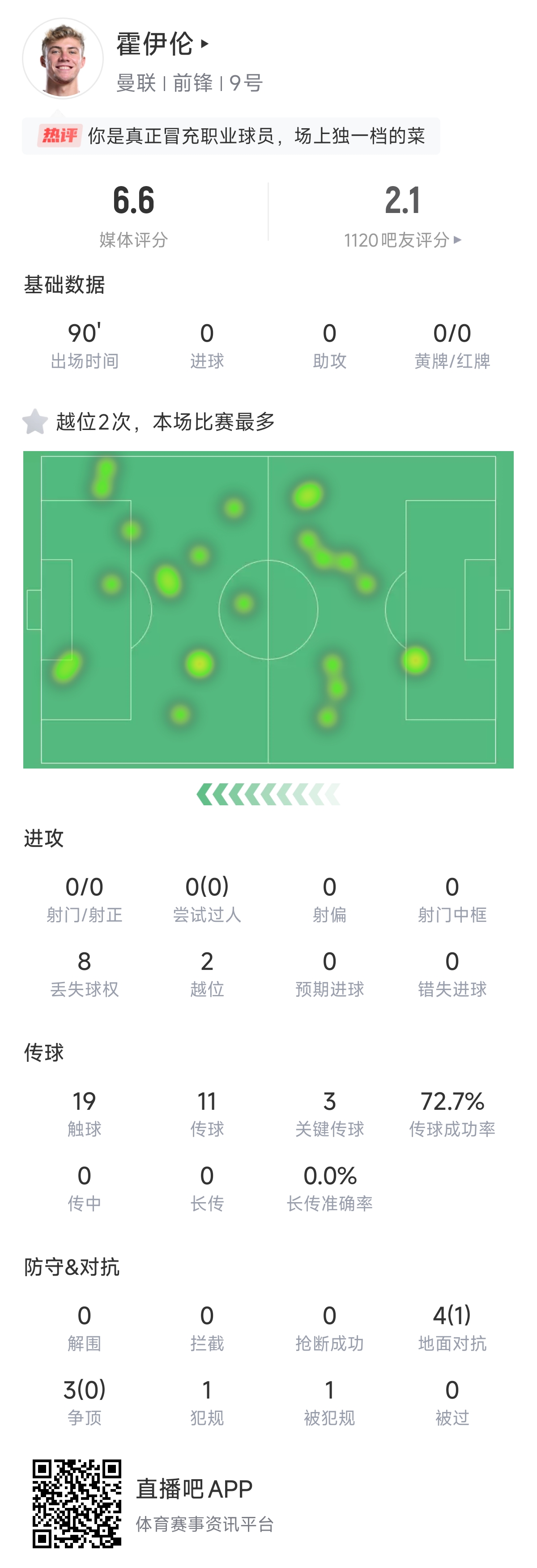 6000萬(wàn)身價(jià)怕是要掉了…22歲霍伊倫熱點(diǎn)圖遍布全場(chǎng)但0射0正2越位