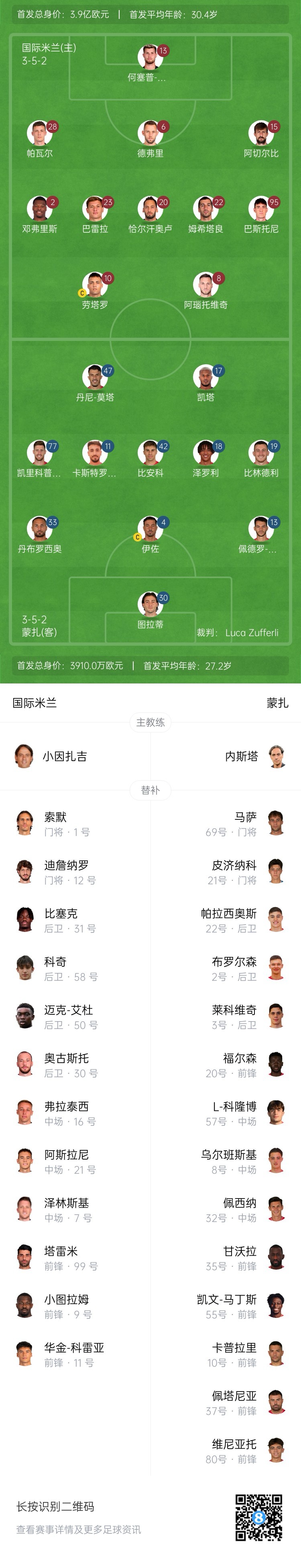 3月9日訊 意甲第28輪,國米主場(chǎng)迎戰蒙扎比賽即將打響。賽前首發(fā)出爐。