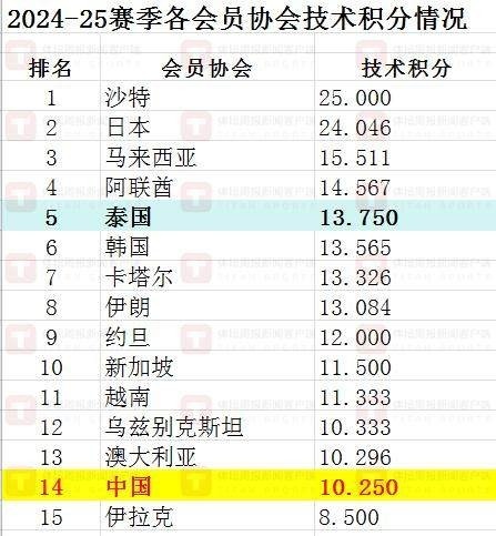 亞足聯(lián)在2月底即亞冠精英聯(lián)賽1/8決賽展開(kāi)前,公布了亞足聯(lián)本賽季中期下屬各會(huì )員協(xié)會(huì )的技術(shù)積分排名,記者也曾撰文專(zhuān)門(mén)介紹過(guò),中超聯(lián)賽以53.837分排名亞洲第七、東亞第三;泰國聯(lián)賽則以53.069分排名亞洲第八、東亞第四。就是說(shuō),截至前半賽季,中超僅僅領(lǐng)先泰超0.768分。