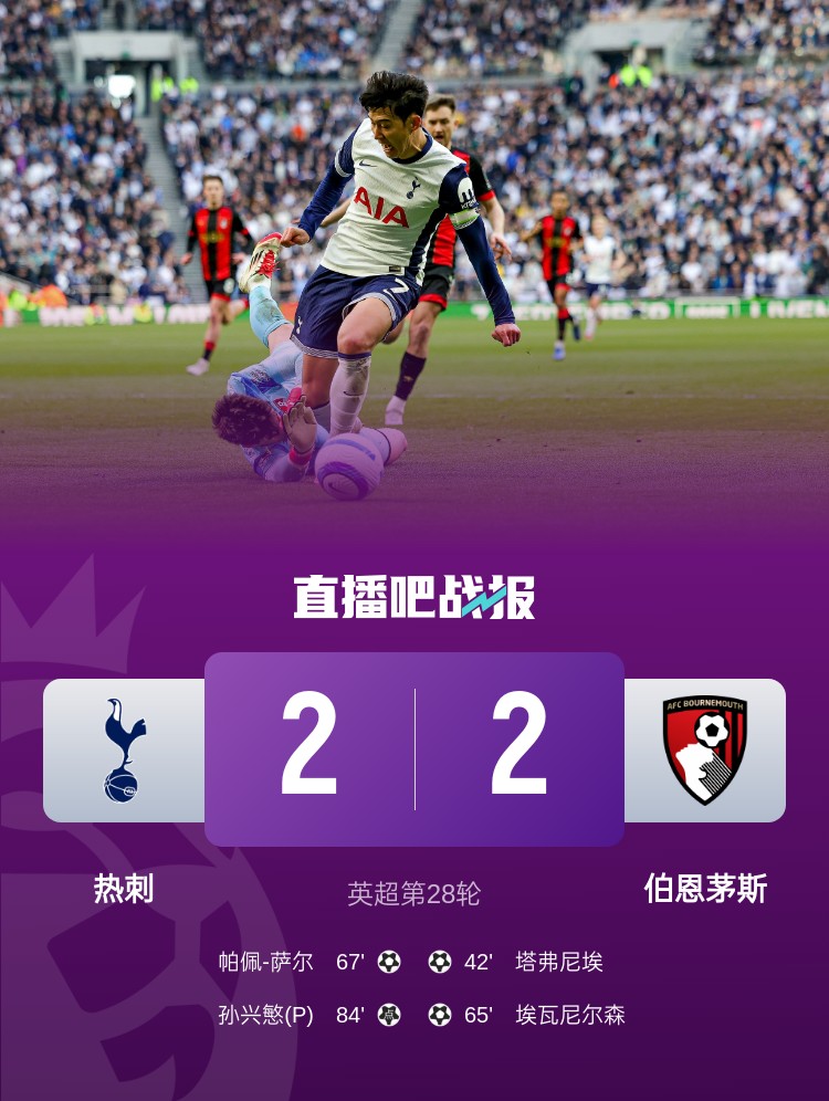 熱刺2-2戰平伯恩茅斯,薩爾、孫興慜破門(mén),熱刺未能主場(chǎng)全取3分。