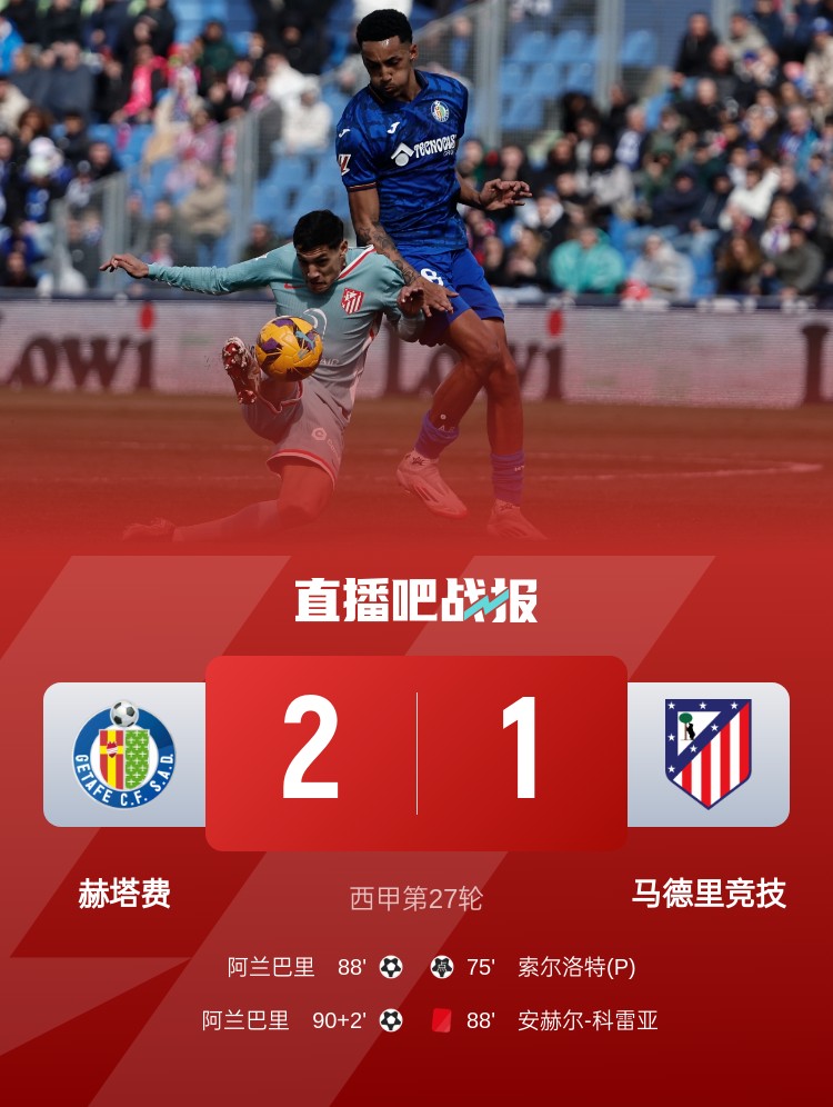 馬競1-2不敵赫塔費,科雷亞第88分鐘染紅,馬競錯失登頂機會(huì )!