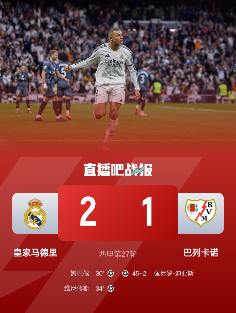 皇馬本輪2-1擊敗巴列卡諾,姆巴佩、維尼修斯破門(mén),皇馬多賽平榜首!