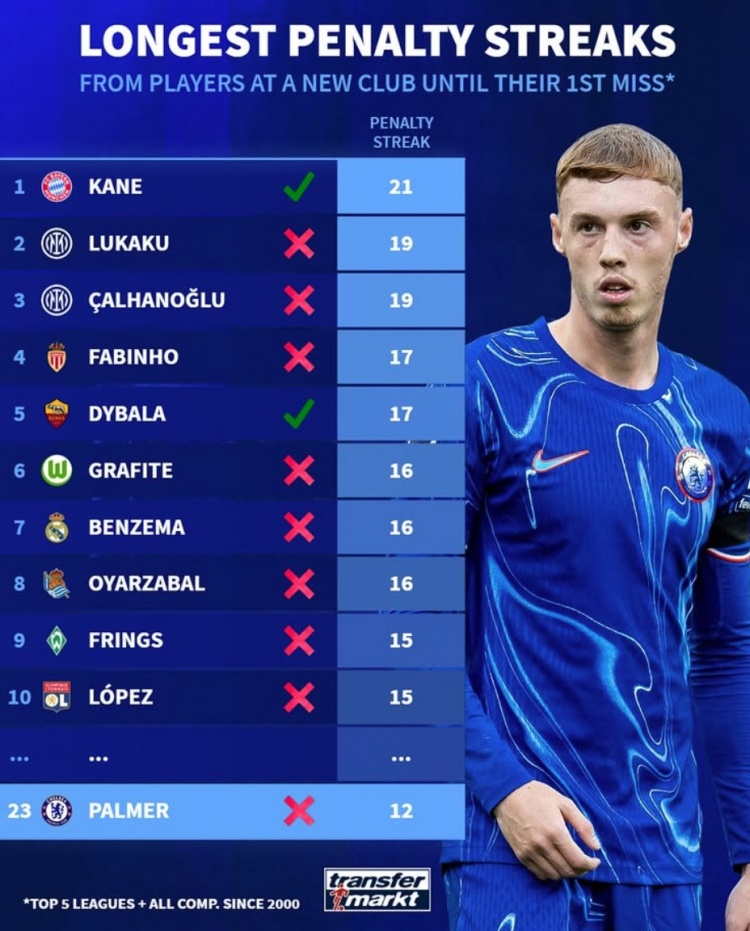 《轉會(huì )市場(chǎng)》統計了新世紀以來(lái)五大聯(lián)賽球員在新東家在不罰丟情況下連續命中點(diǎn)球紀錄,凱恩21球居首并且仍未罰丟。