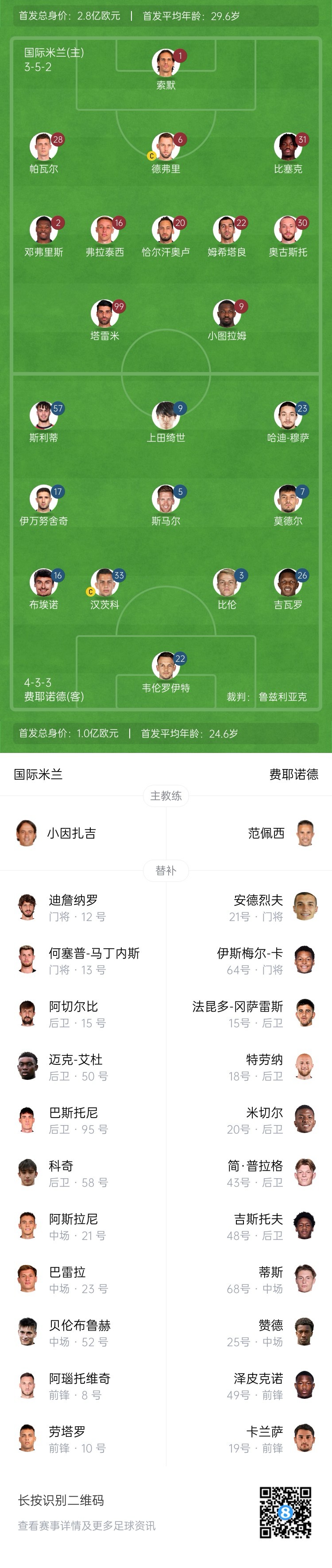 3月12日訊 歐冠16強次回合,國米主場(chǎng)迎戰費耶諾德比賽即將打響。賽前首發(fā)出爐。