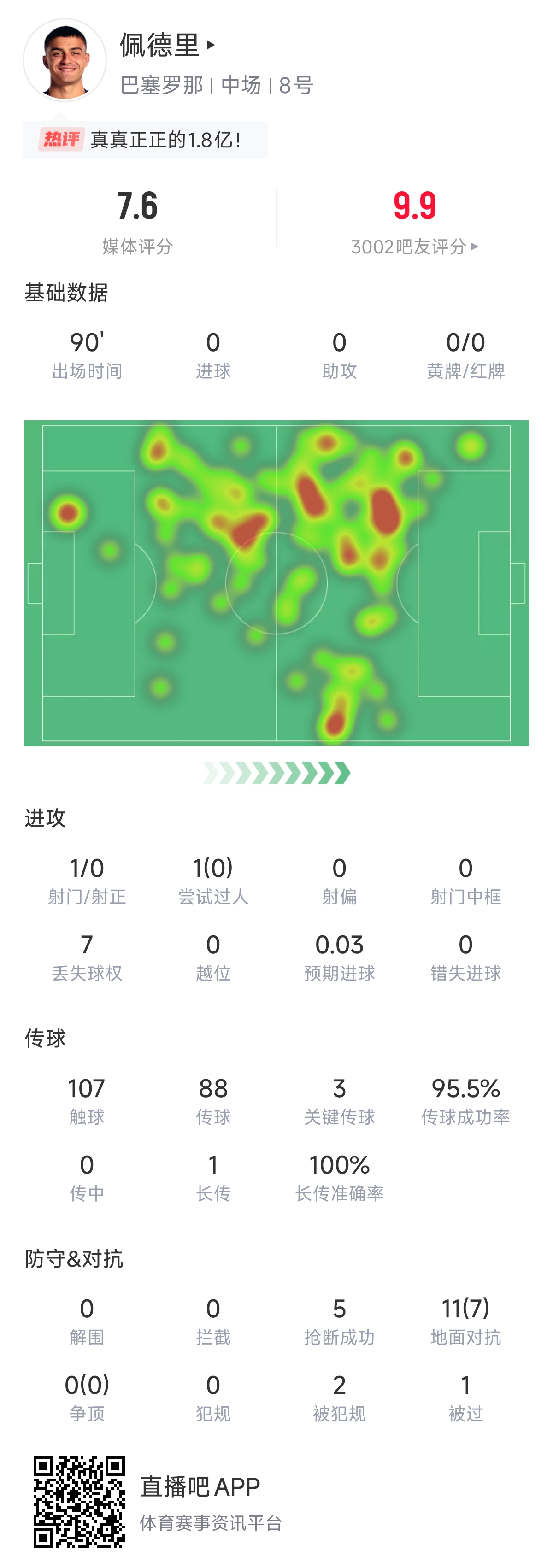 佩德里本賽季幾乎全勤,只缺席巴薩一場(chǎng)比賽,他在41場(chǎng)比賽里貢獻5球6助。不過(guò)進(jìn)球數據并不能體現出佩德里的表現。例如他在本場(chǎng)比賽首發(fā)出戰,貢獻3次關(guān)鍵傳球,觸球107次僅有7次丟失球權,傳球成功率達到95.5%,另外他還有5次搶斷以及7次地面對抗成功。