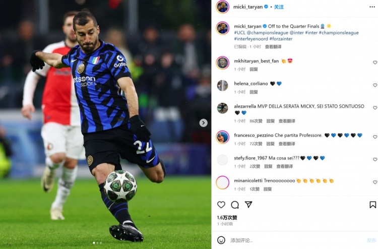 本場(chǎng)表現出色的姆希塔良曬出自己的比賽照,并表示:“晉級八強戰!”