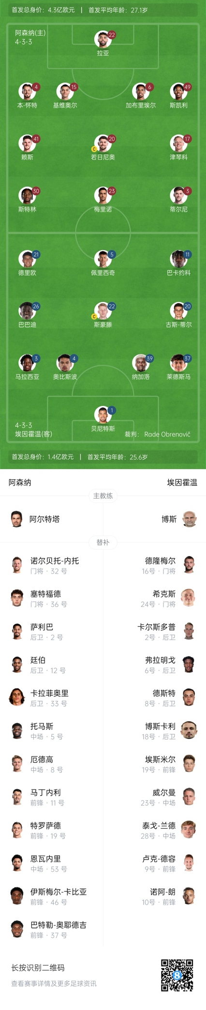阿森納首發(fā):22-拉亞、4-本-懷特、15-基維奧爾、6-加布里埃爾、49-斯凱利、41-賴(lài)斯、20-若日尼奧、17-津琴科、30-斯特林、23-梅里諾、3-蒂爾尼