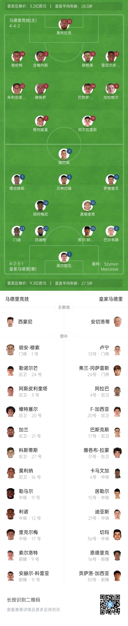 3月13日訊 歐冠1/8決賽次回合,馬德里競技主場(chǎng)迎戰皇家馬德里,賽前首發(fā)名單公布。