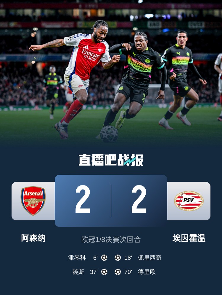 歐冠1/8決賽次回合,阿森納2-2戰平埃因霍溫,總比分9-3晉級八強。上半場(chǎng),津琴科破門(mén),佩里西奇扳平,賴(lài)斯頭球建功,斯特林送出2次助攻&錯失1次單刀球機會(huì );下半場(chǎng),德里歐挑射破門(mén)。