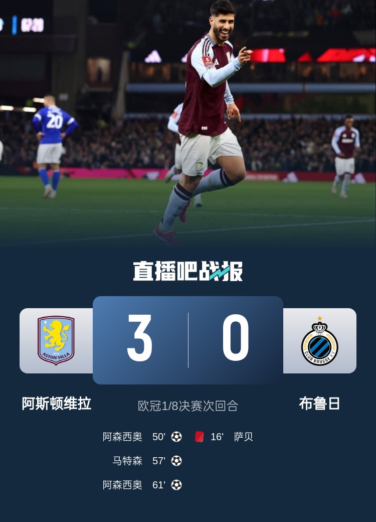 歐冠1/8決賽次回合,維拉3-0擊敗布魯日,總比分6-1晉級歐冠8強。上半場(chǎng),大馬丁精準長(cháng)傳找到拉什福德,后者制造直紅;下半場(chǎng),阿森西奧替補登場(chǎng)雙響,另有一次中柱,拉什福德貢獻1助攻,馬特森打進(jìn)1球。