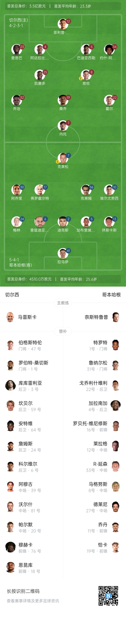 切爾西替補:1-羅伯特-桑切斯、47-伯格斯特倫、6-科爾維爾、59-坎貝爾、3-庫庫雷利亞、64-安特維、24-里斯-詹姆斯、39-阿穆古、81-沃爾什、20-帕爾默、76-穆赫卡、18-恩昆庫