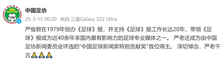 中國足協(xié)發(fā)文悼念《足球》報創(chuàng )刊人嚴俊君:深切悼念,嚴老千古