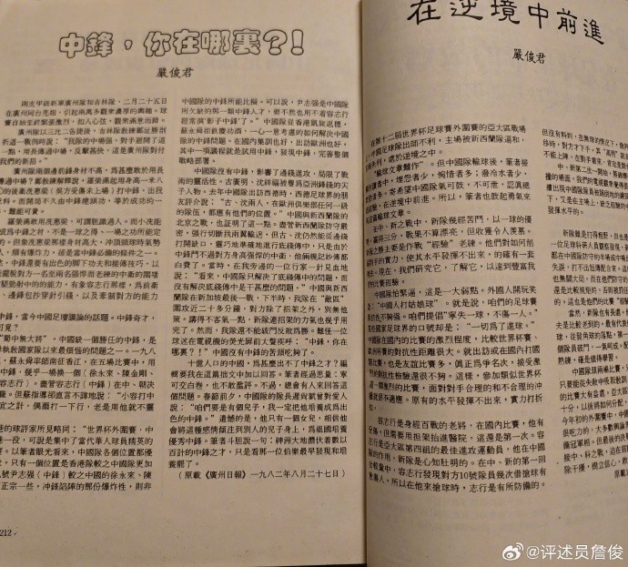 父親說(shuō),這些小薄紙片挺“解渴”的。那里肯定也有嚴俊君老總的“耕耘之作”。我開(kāi)始工作后,和“足球報”很多同行成為好友,可惜那時(shí)嚴總已經(jīng)退居二線(xiàn),無(wú)緣相見(jiàn)。今晚得知他老人家駕鶴西去,心中惆悵。謝謝您!曾經(jīng)帶我們這些球迷去“看世界”……