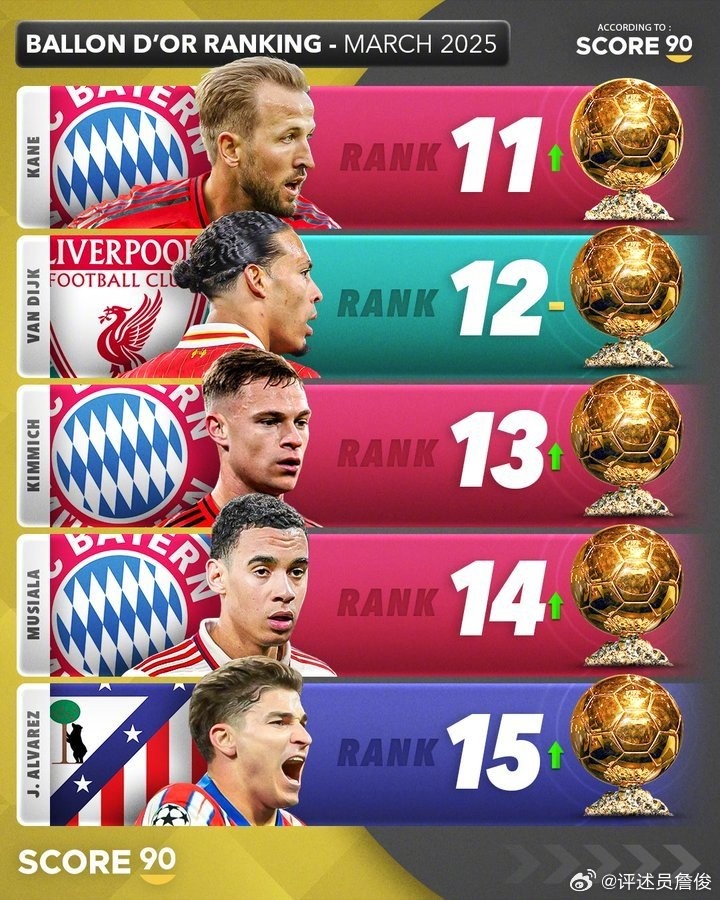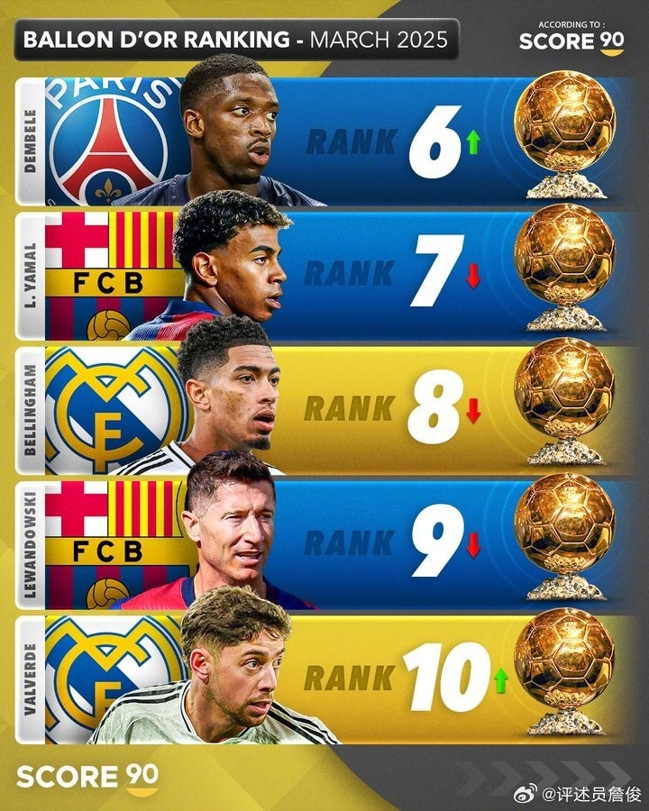 詹俊說(shuō):國外網(wǎng)站評分系統中2025年金球獎熱門(mén)人選前十五名。本季已經(jīng)打進(jìn)30球迎來(lái)個(gè)人職業(yè)生涯巔峰的登貝萊,會(huì )不會(huì )是“黑馬”?如果大巴黎本季歐冠最終捧杯的話(huà)……