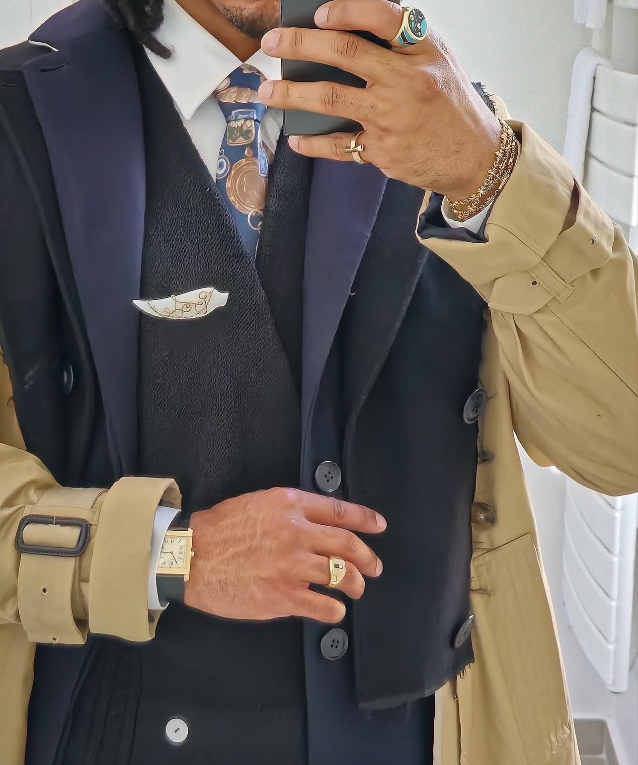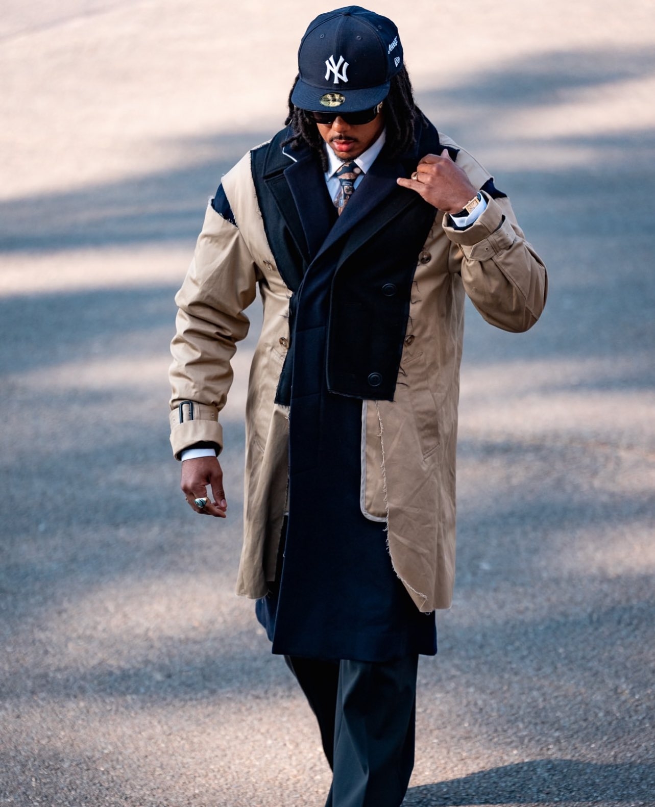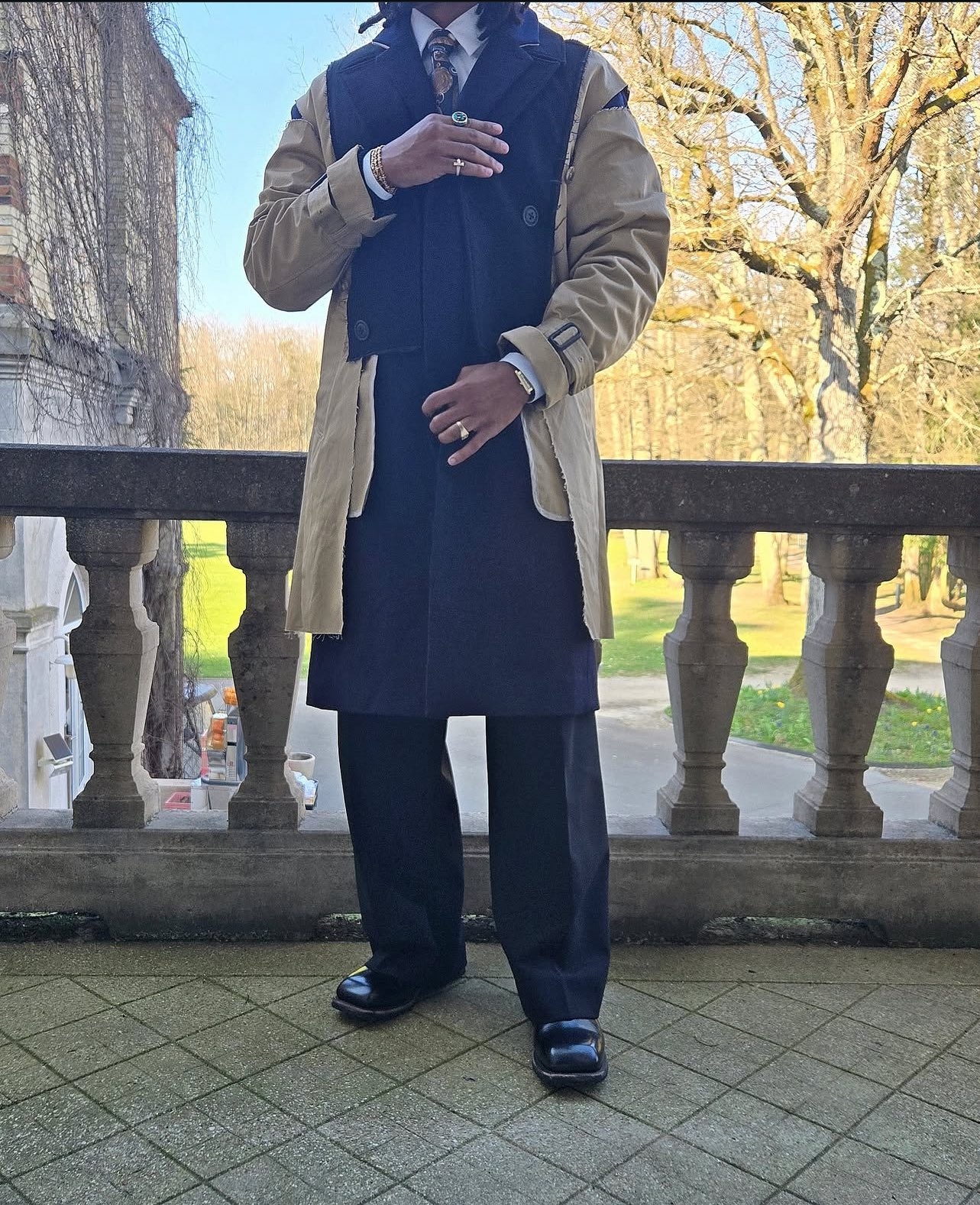 這一次孔德的穿搭中,最引人注目的就是他身上的拼接外套,這件大衣來(lái)自日本小眾設計師品牌FACETASM,是2022-23的秋冬系列中的一件。