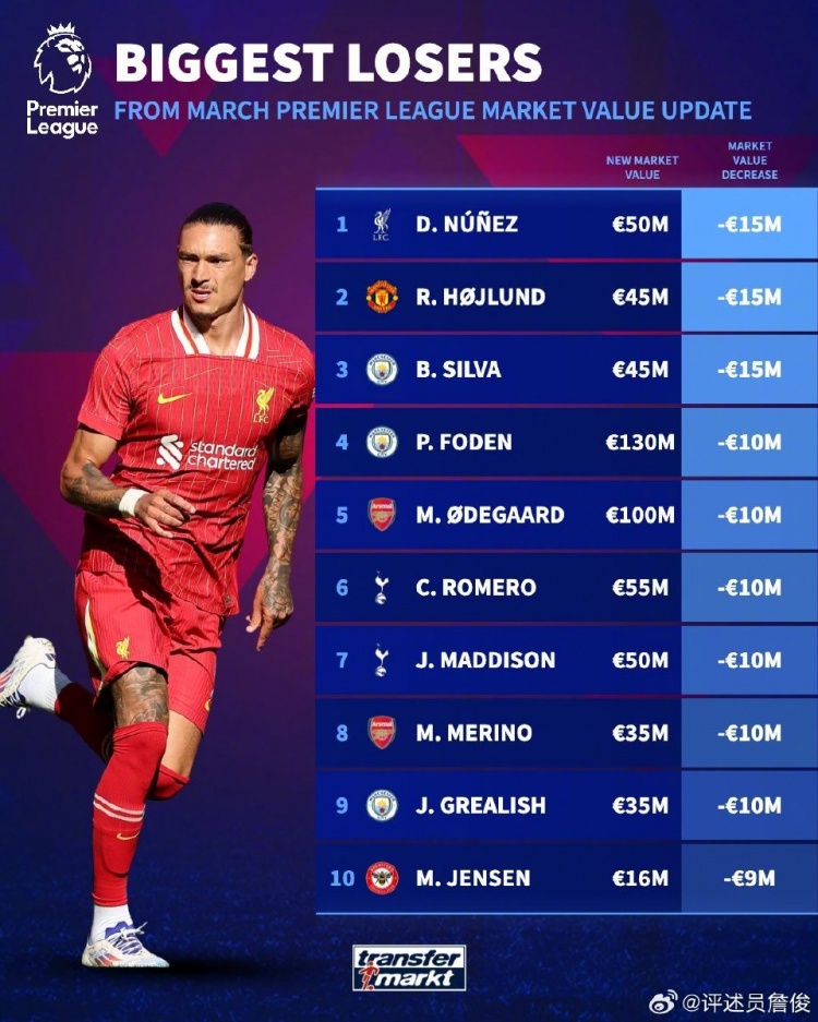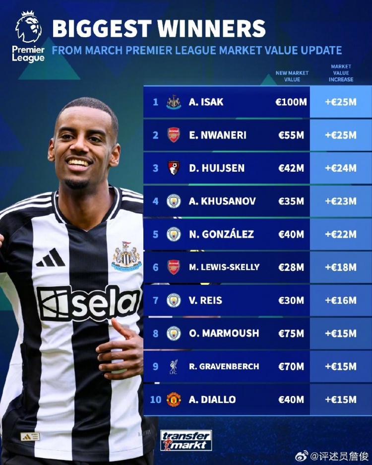 球員身價(jià)漲幅方面,伊薩克、恩瓦內利以2500萬(wàn)歐的漲幅并列最多;跌幅方面,努涅斯、霍伊倫、B席均下跌1500萬(wàn)歐并列最多,槍手中場(chǎng)梅里諾下跌1000萬(wàn)歐,并列排第4位。