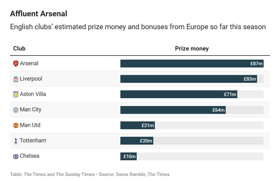 本賽季歐足聯(lián)調整了歐戰收入分配體系,使賽季期間的表現獲得更多經(jīng)濟回報而非依賴(lài)歷史成績(jì)。與上賽季相比,歐冠的總獎金池增加了20%以上,歐足聯(lián)為比賽勝利、小組賽階段積分榜排名以及晉級淘汰賽提供了比例更高的獎金。而基于俱樂(lè )部歷史表現計算的歐足聯(lián)系數排名所占的獎金比例減少。例如,曼城未能進(jìn)入淘汰賽階段,其預計收入約為6400萬(wàn)英鎊;而阿斯頓維拉晉級四分之一決賽后至少賺了7100萬(wàn)英鎊。