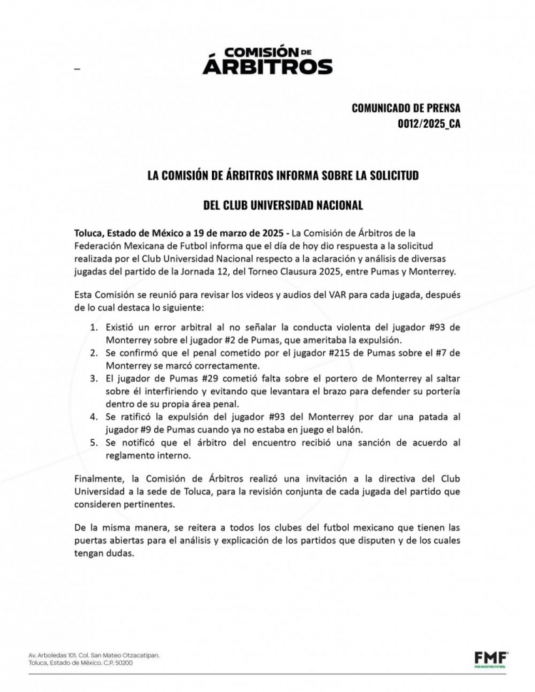 墨西哥美洲獅俱樂(lè )部賽后提出申請,希望墨西哥裁判委員會(huì )對比賽中的判罰做出澄清和分析,裁判委員會(huì )發(fā)布公告,確認當值主裁存在失誤,拉莫斯上半場(chǎng)肘擊對手就應該被罰下,但裁判沒(méi)有對其出示紅牌。