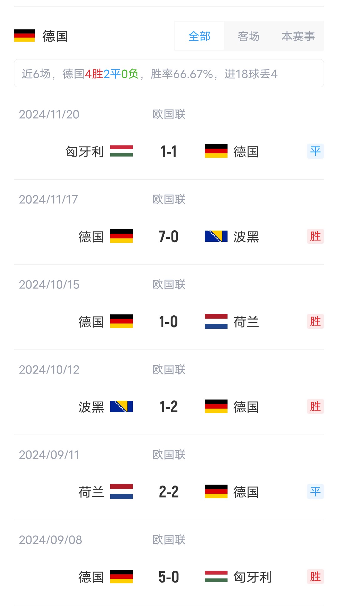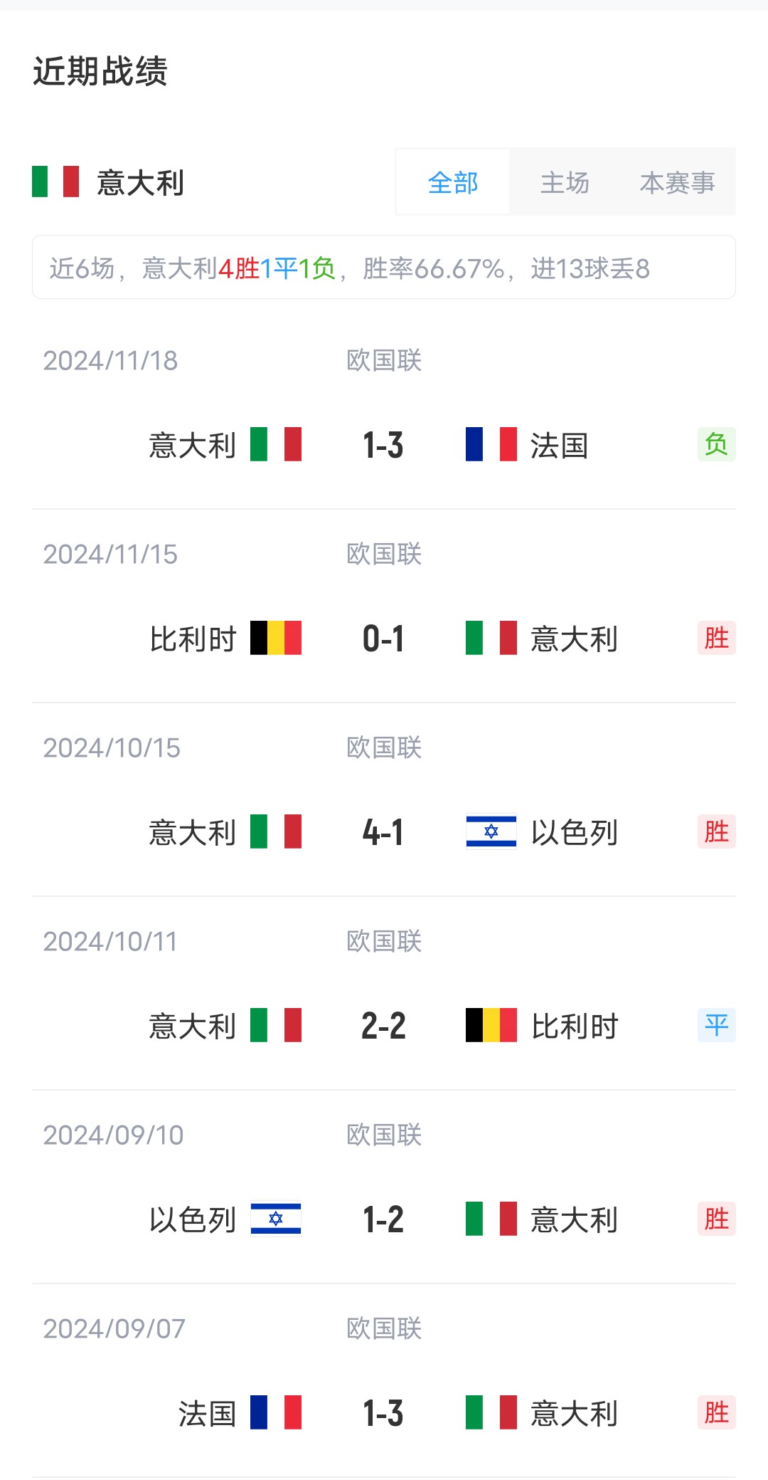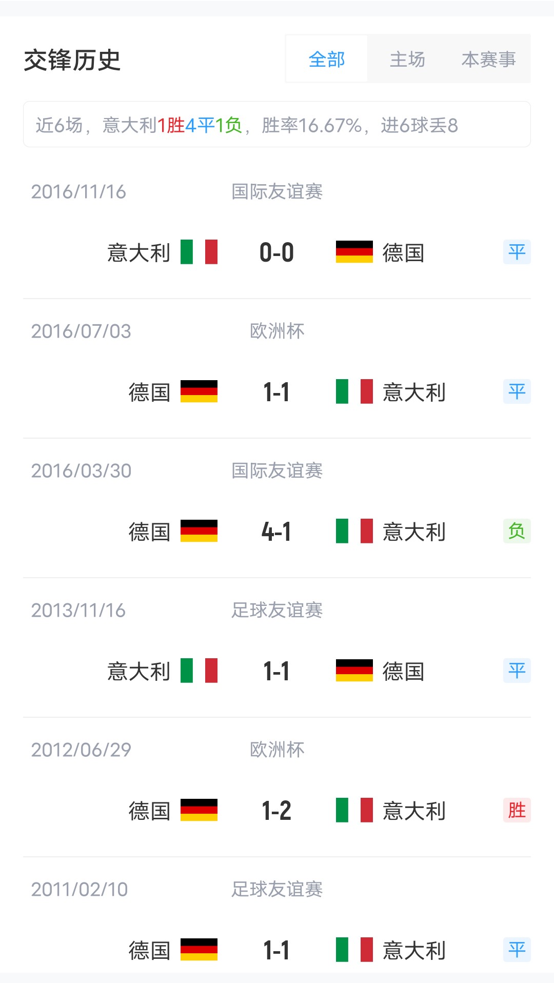 在歐國聯(lián)小組賽中,意大利排名B組第2,德國排名C組第1;雙方近6場(chǎng)直接對話(huà)中,意大利取得了1勝4平1負的戰績(jì)。兩隊最近一次交手,是在2016年11月16日,友誼賽意大利0-0戰平德國。
