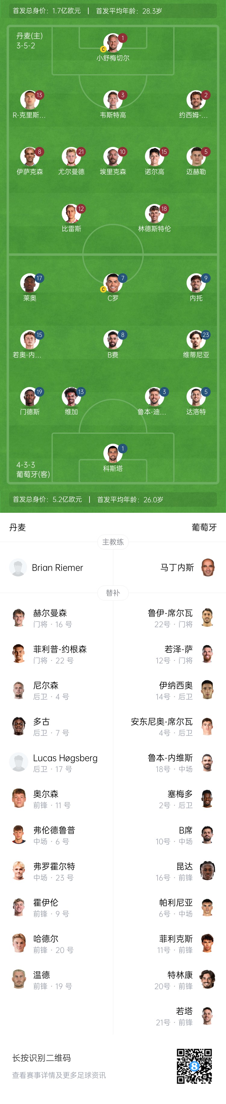 3月21日訊 北京時(shí)間03:45,歐國聯(lián)1/4賽決賽首回合,葡萄牙客場(chǎng)挑戰丹麥。賽前官方公布了雙方的首發(fā)名單。