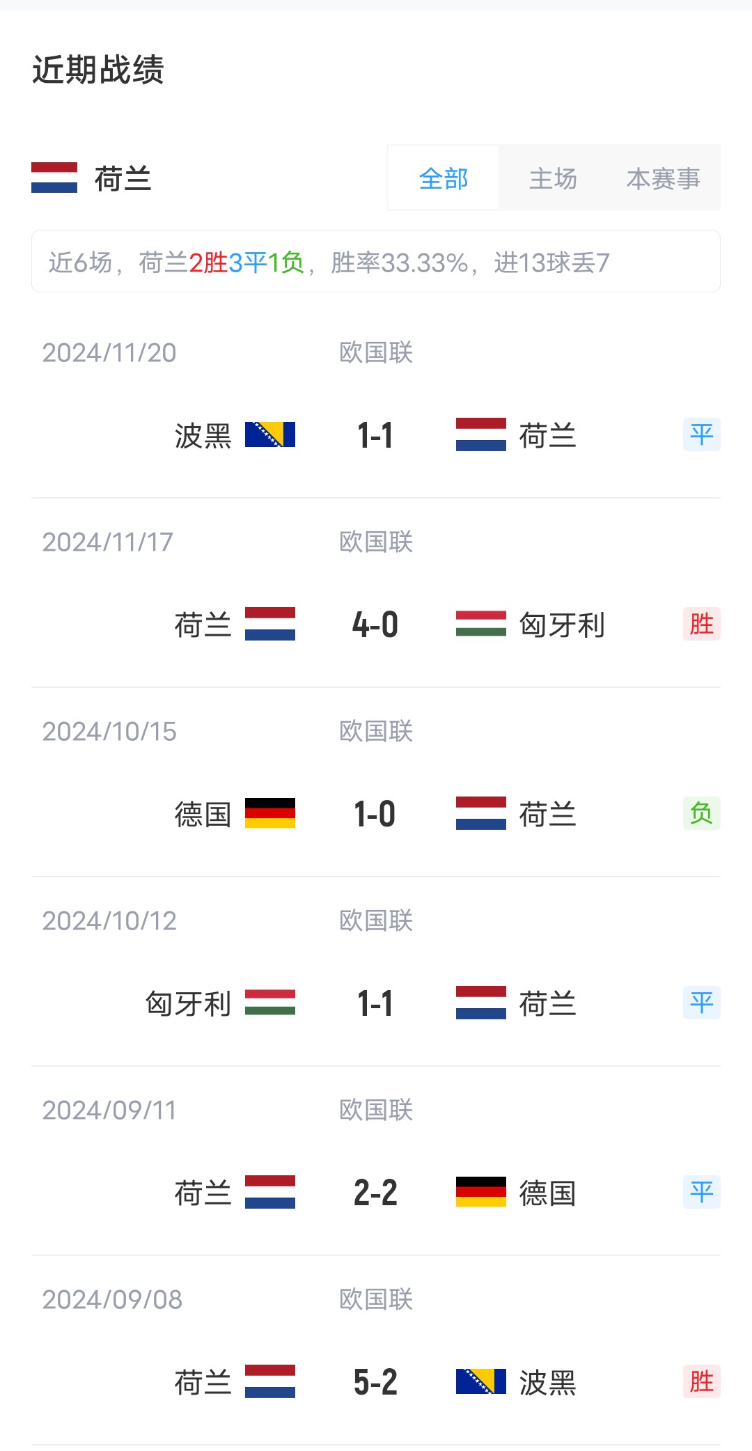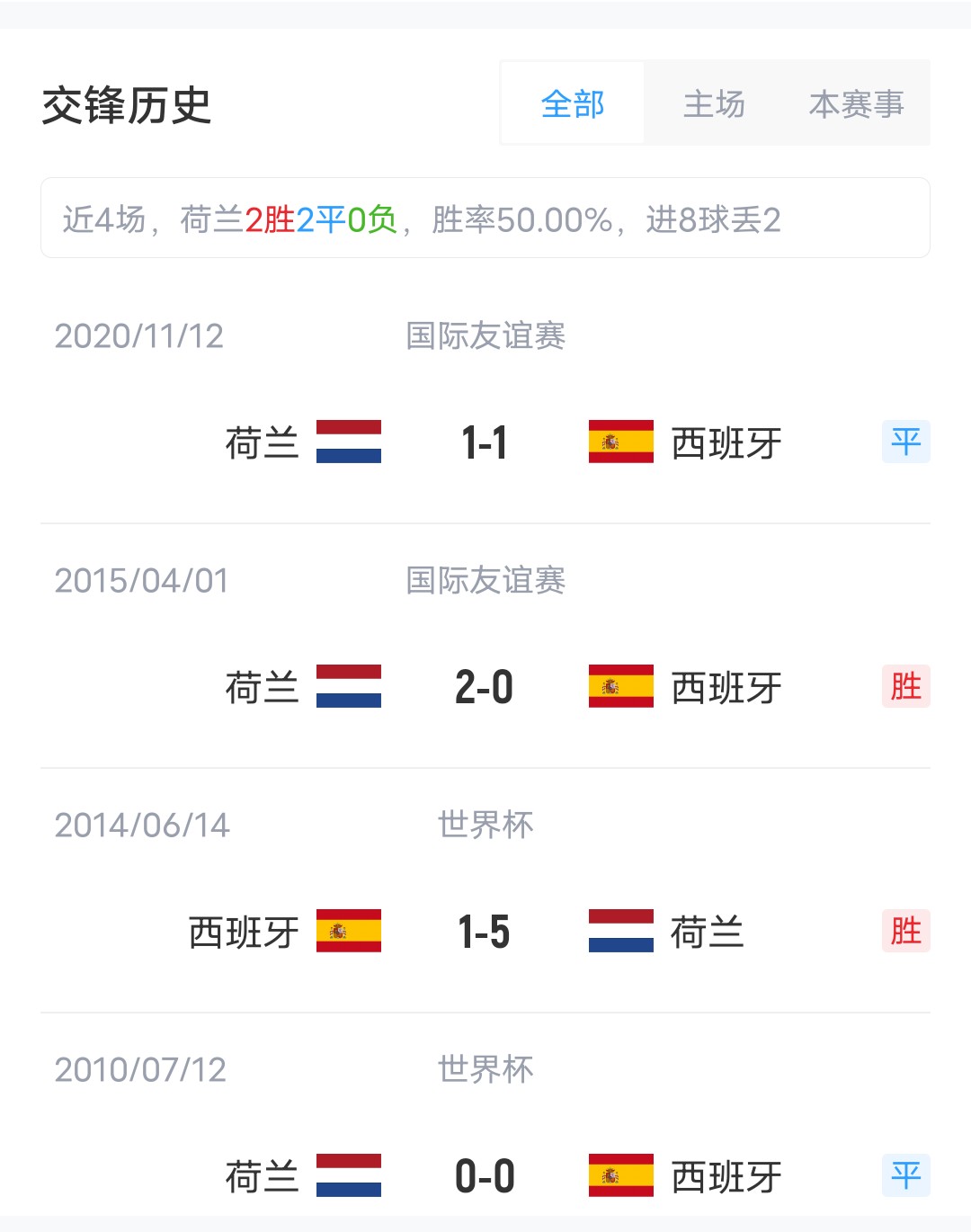 雙方近4場(chǎng)交鋒,荷蘭取得2勝2平的戰績(jì)稍居上風(fēng)。