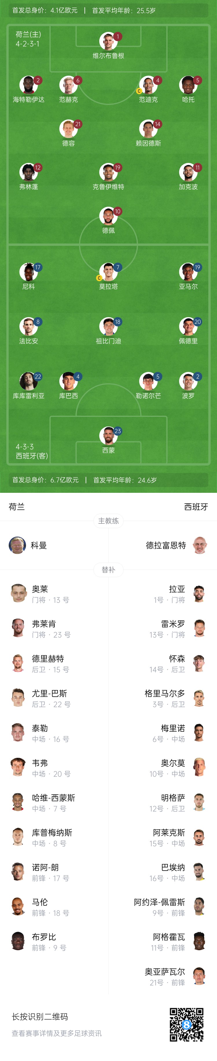 荷蘭替補:13-奧萊、23-弗萊肯、7-哈維-西蒙斯、8-庫普梅納斯、9-布羅比、15-德里赫特、16-泰勒、17-諾阿-朗、18-馬倫、20-韋弗、22-巴斯