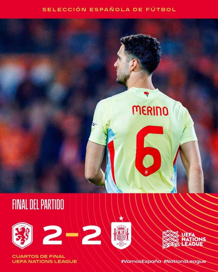 梅里諾補時(shí)絕平,荷蘭2-2西班牙,西班牙歐國聯(lián)五連勝終結。