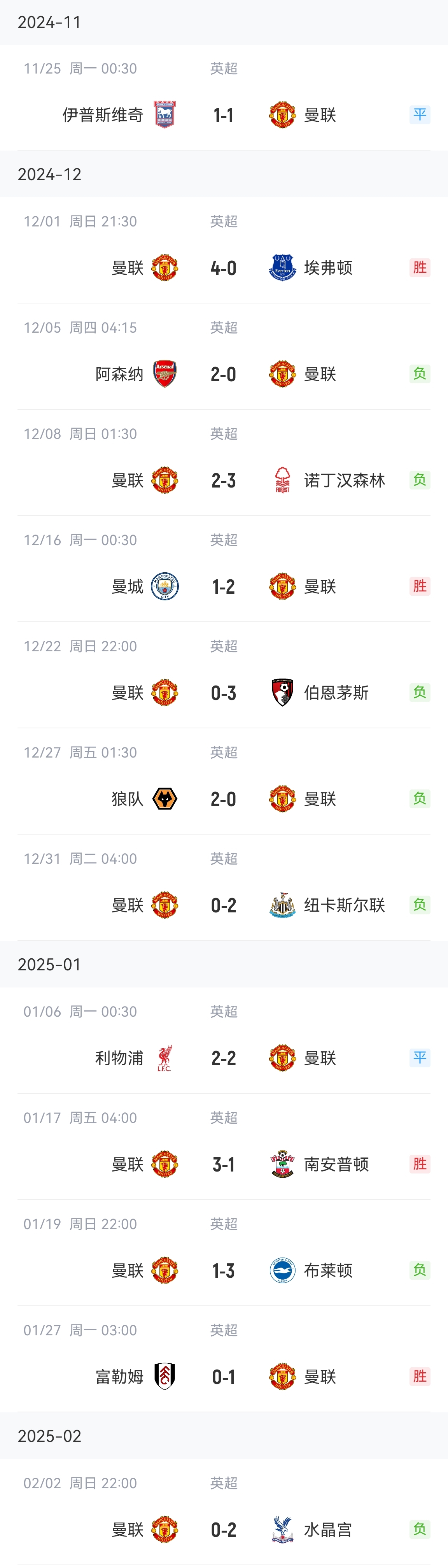 02月03日訊 曼聯(lián)主場(chǎng)0-2完敗于水晶宮,遭遇阿莫林帶隊以來(lái)的聯(lián)賽第7敗。