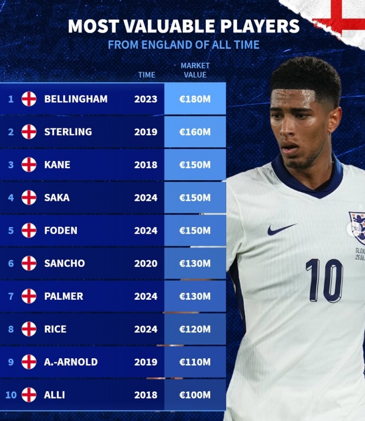 德轉列英格蘭隊史身價(jià)前十:貝林厄姆1.8億,斯特林、阿里均上億