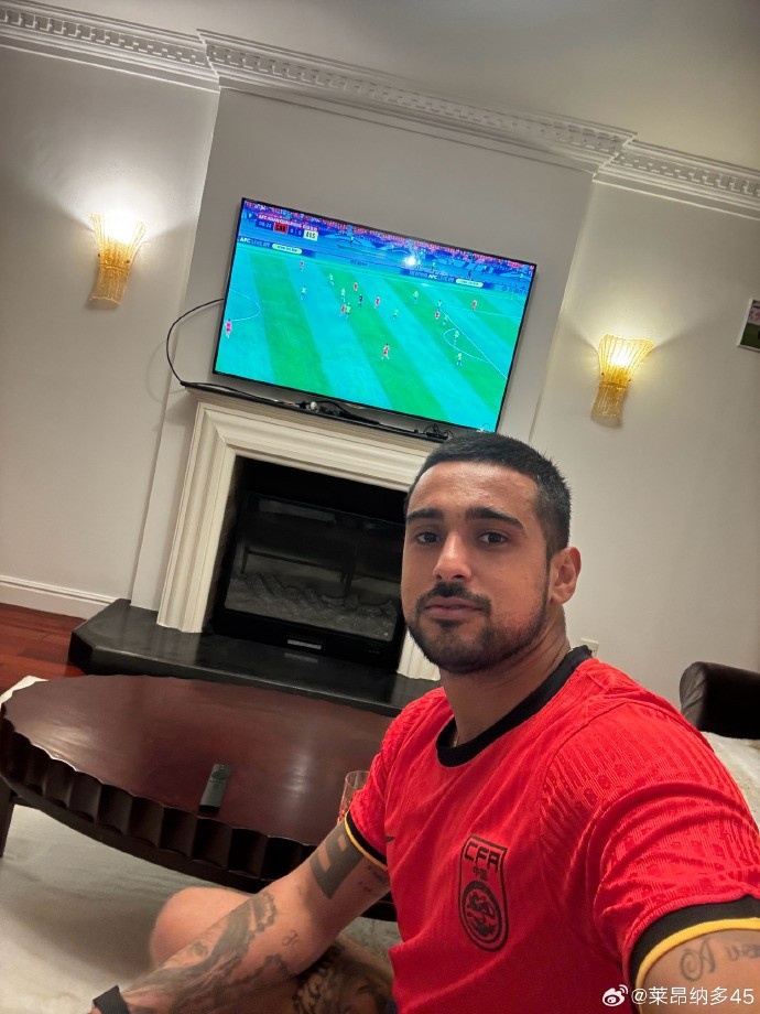 萊昂納多身穿國足球衣,在社媒打拼音為國足助威:Jiāyóu