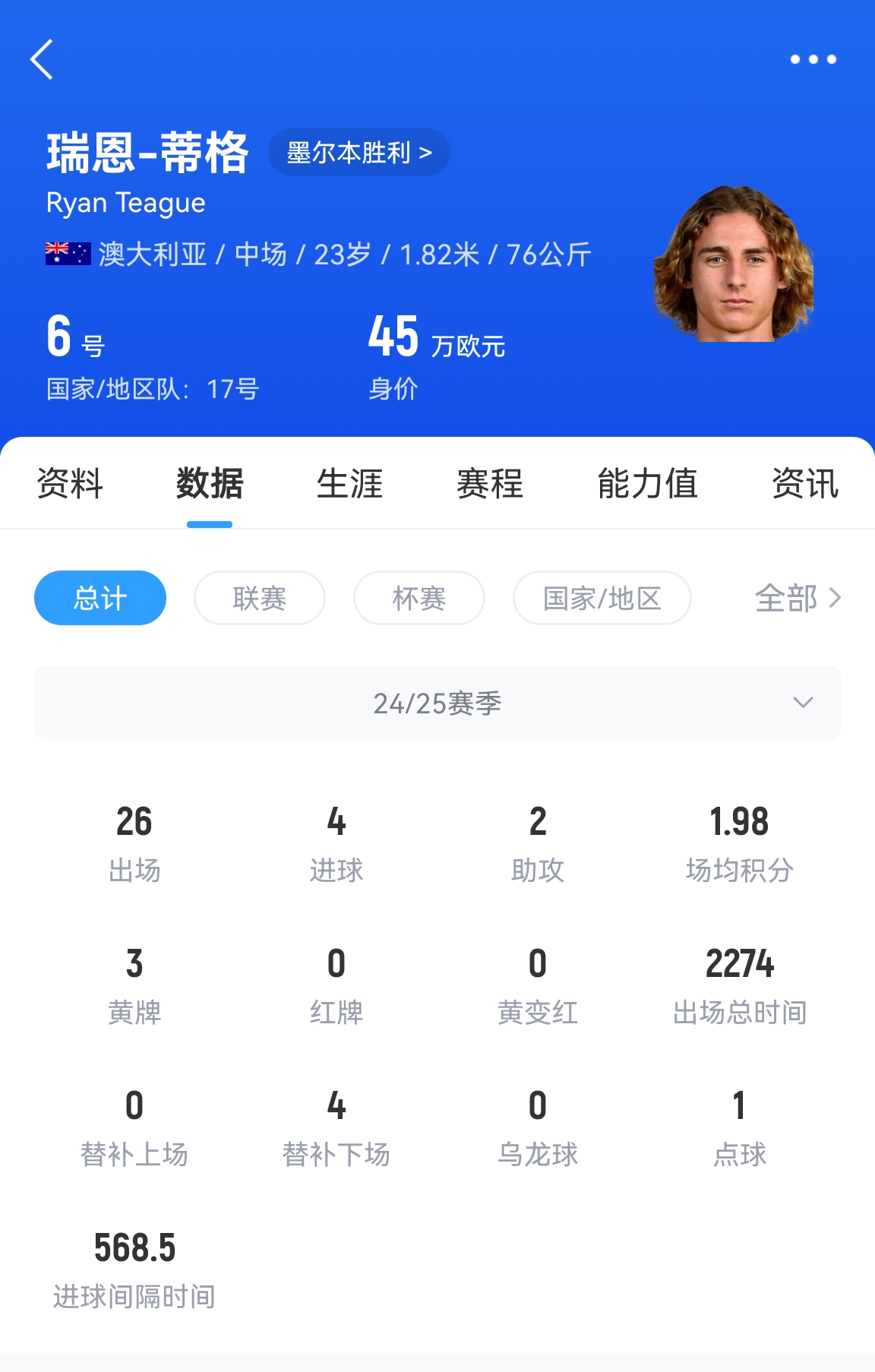 蒂格本賽季為墨爾本勝利出場(chǎng)26次打入4球2助攻,他的德轉身價(jià)為45萬(wàn)歐元。