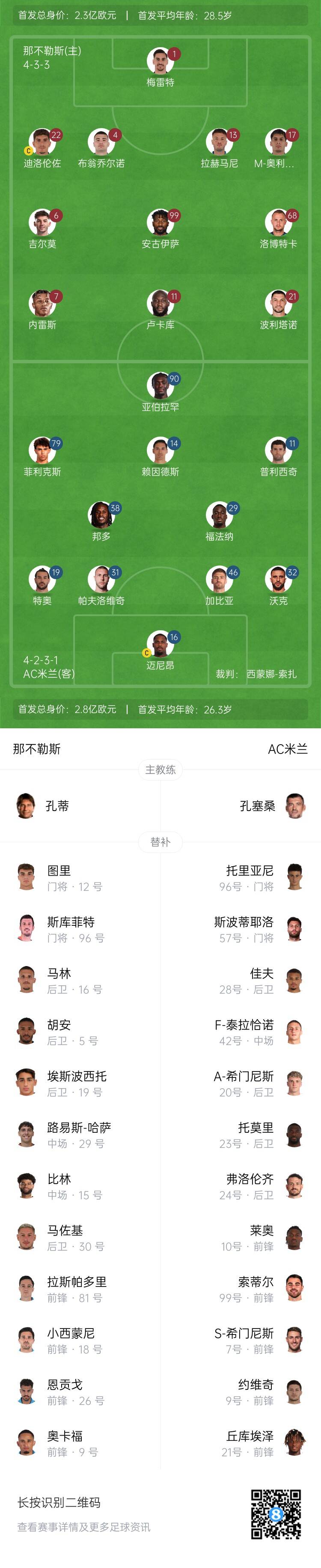 那不勒斯替補:12-圖里、96-斯庫菲特、5-胡安、9-奧卡福、15-比林、18-小西蒙尼、19-埃斯波西托、26-恩貢戈、29-哈薩、30-馬佐基、81-拉斯帕多里